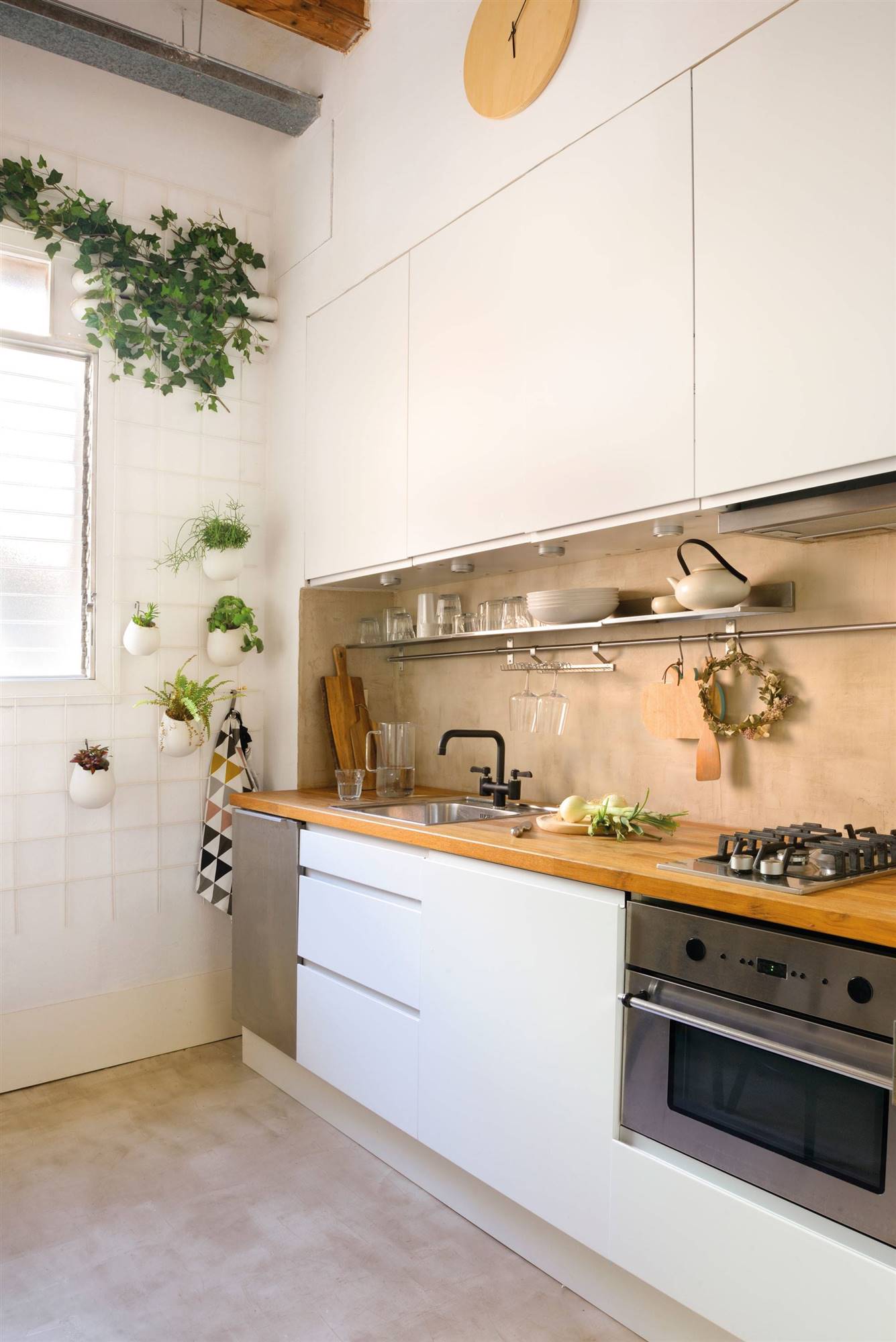Igual que has conseguido dar nuevos usos a las traseras de puertas y cajones, puedes hacer lo mismo con el espacio libre entre las baldas. Una solución es utilizar pequeñas cestas colgadas de los muebles para guardar objetos pequeños y ligeros, como platos, vasos, copas de vino, botes de especias o paños de cocina. De este modo, podrás acceder mejor a ellos a la vez que mantienes todo perfectamente organizado.