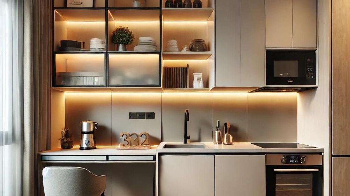 La iluminación adecuada puede transformar una cocina pequeña. Añadir luces debajo de los gabinetes, en los estantes o en áreas clave aumenta la funcionalidad del espacio y crea un ambiente acogedor. La iluminación estratégica también ayuda a evitar zonas oscuras, que pueden hacer que el espacio parezca aún más reducido.