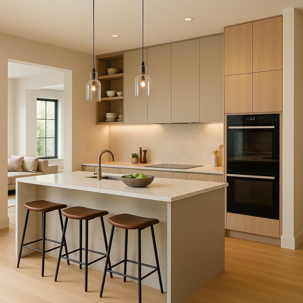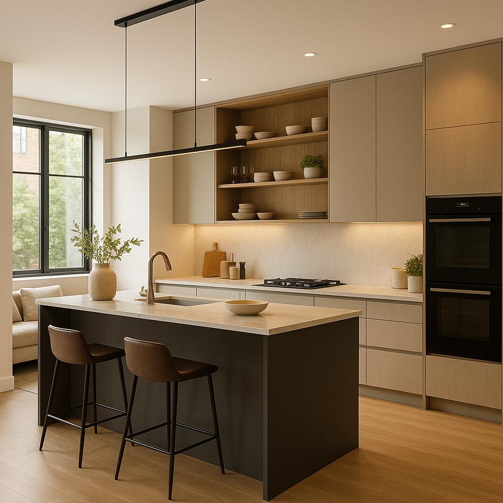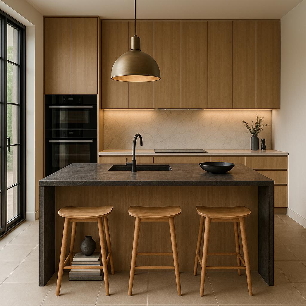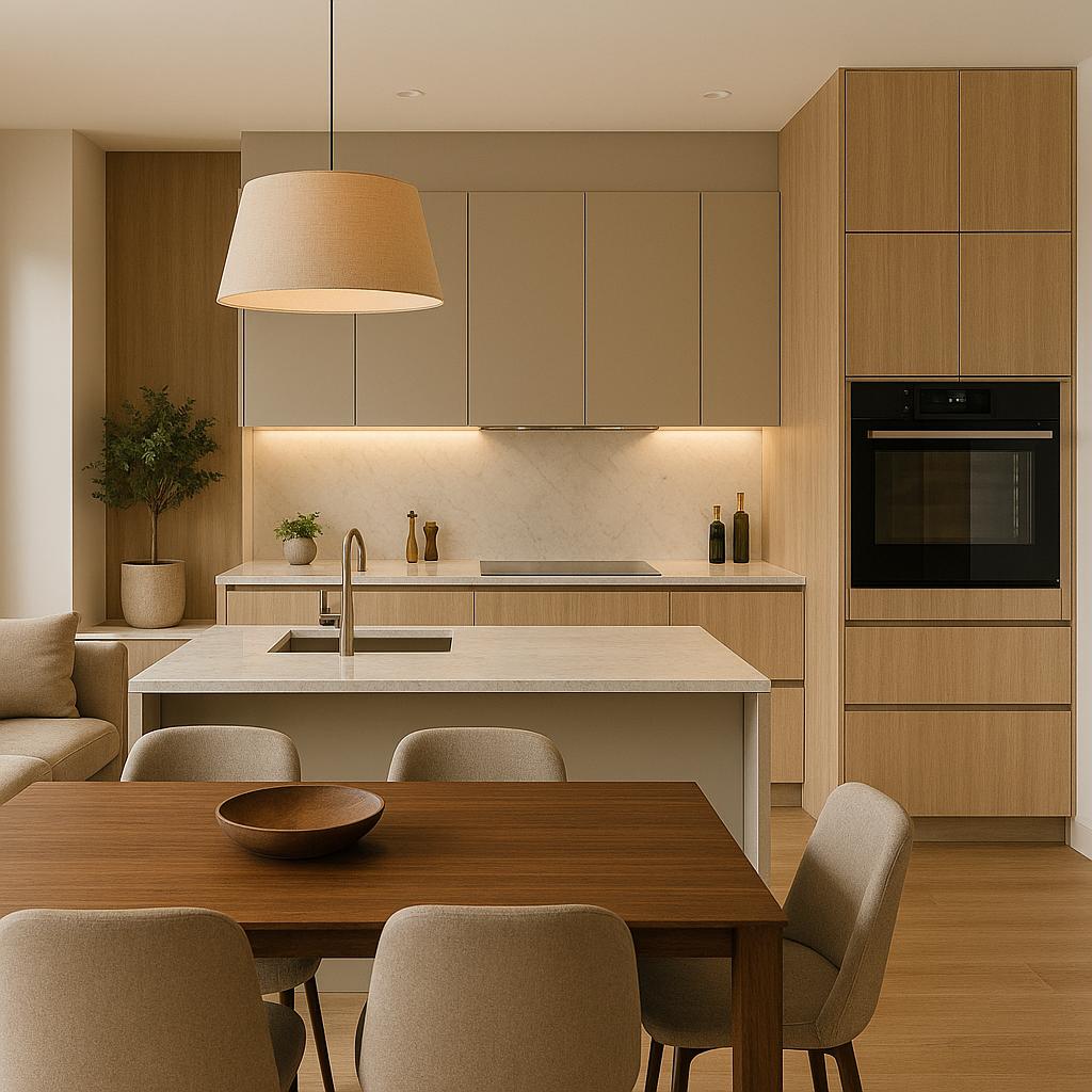 La tendencia actual combina lo natural con lo refinado. Las encimeras de piedra en tonos neutros, los frentes de madera clara y los detalles en metal cepillado logran cocinas acogedoras y sofisticadas al mismo tiempo. El mármol, el granito y las superficies porcelánicas continúan siendo protagonistas por su durabilidad y estética atemporal.