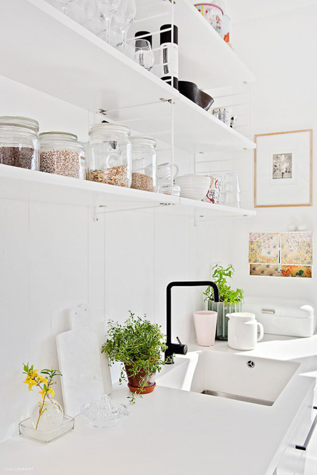 Otro truco para ahorrar espacio es usar estanterías en zonas altas, en vez de usar estanterías de pie. Estas estanterías se pueden colocar en las paredes, y en caso de usar estanterías grandes, podemos aprovechar la distancia que hay hasta el techo para aumentar los objetos a almacenar.