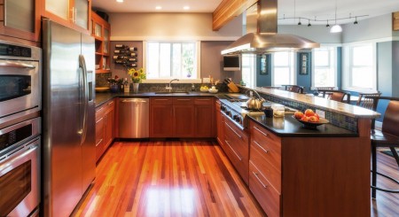La madera es un material que se ha usado siempre en las casas porque resulta acogedor y cálido, pero puede ser demasiado delicado para una cocina, teniendo en cuenta que se pueden derramar líquidos y que, al ser un material poroso, lo absorberá todo. Las últimas tecnologías han avanzado en este tema y a los suelos de madera les añaden una capa de poliuretano para que sean más resistentes. En este caso es muy buena idea usarla para cocinas que están integradas dentro del salón, ya que dará la sensación de continuidad visual.