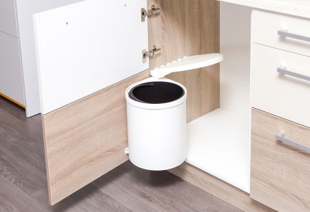 También conocidos como cubo/puerta, se instalan por medio de un soporte debajo de la tarja o fregadero de la cocina, que se asegura a las paredes internas del espacio; se retraen por medio de un canal de cajonera al abrir la puerta del espacio.